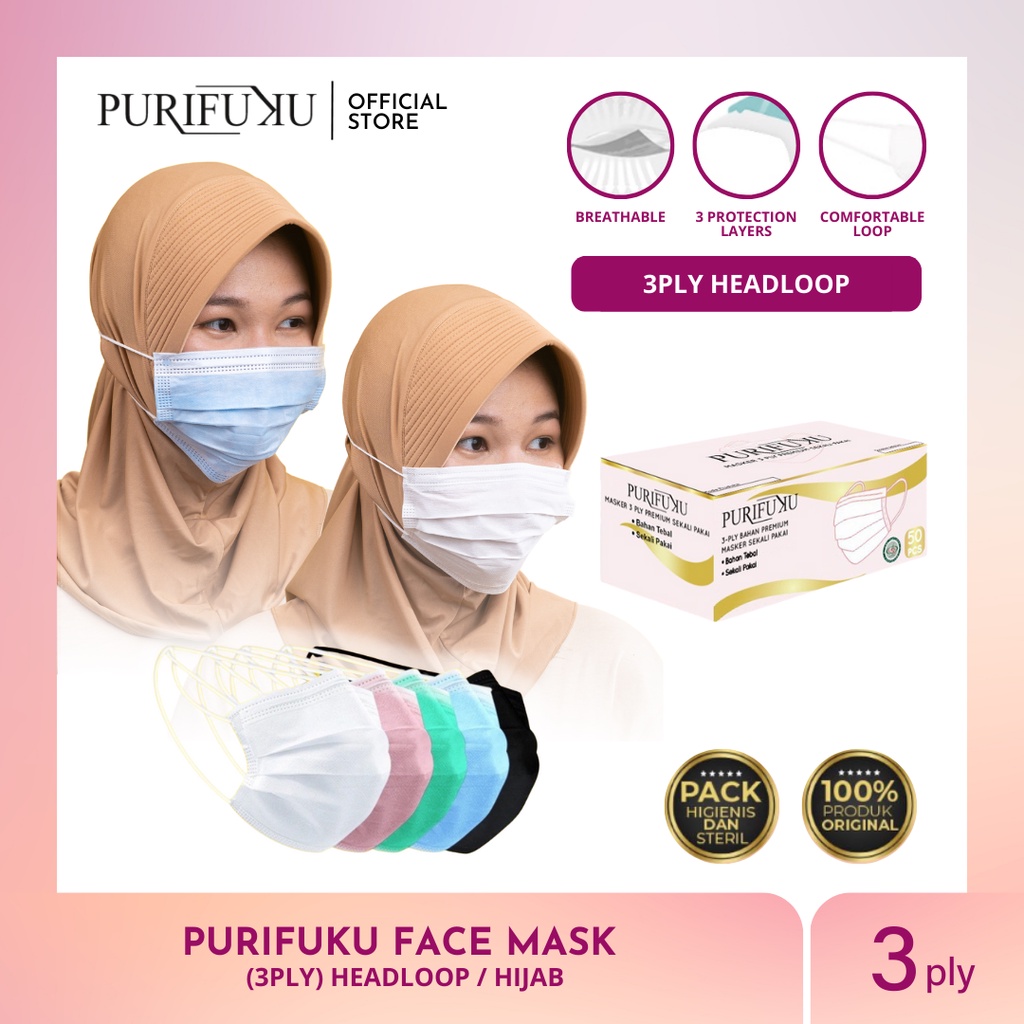 Jual Purifuku Masker Hijab Putih Premium 3ply Headloop 1 Box Isi 50 Disposable Masker Wajah Face Masks Indonesia Shopee Indonesia